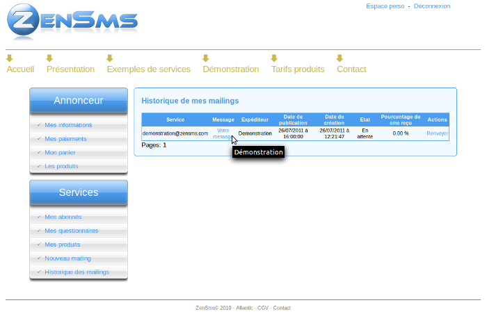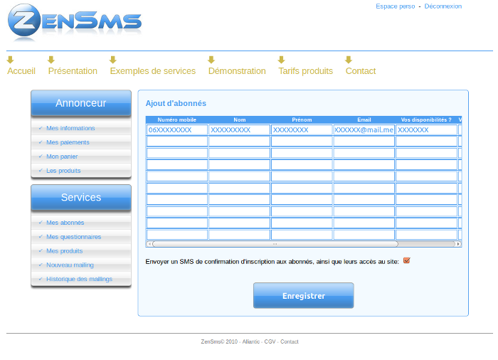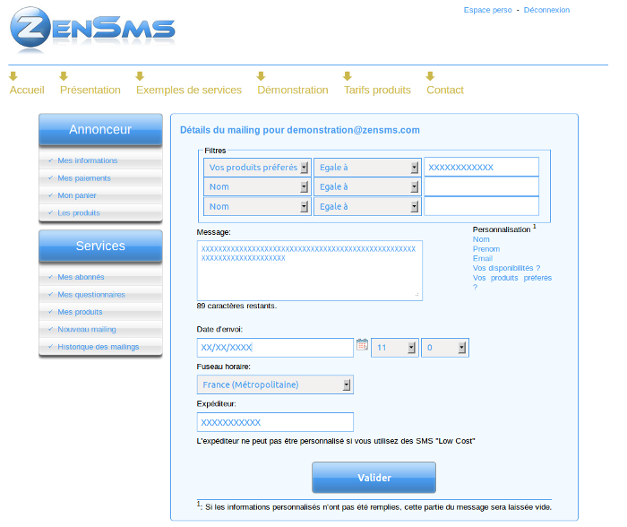 Il s'agit ici de la page principale pour créer son mailing, vous pouvez y appliquer vos filtres (en fonction des informations dont vous disposez sur vos contacts), écrire votre message et personnaliser la date et l'heure de l'envoi. Si vous utilisez notre service SMS Premium vous pourrez également personnaliser le nom de l'expéditeur.